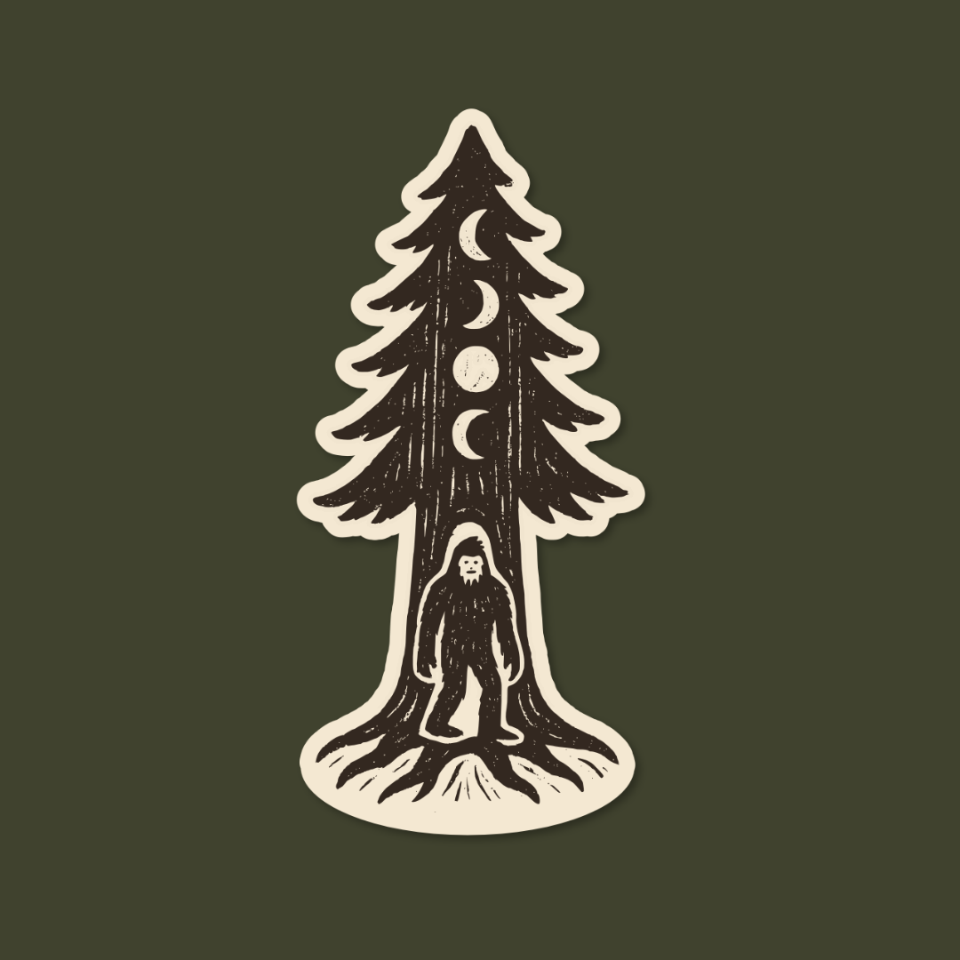 A mystical, woodcut‑style emblem blending forest folklore and lunar symbolism, this sticker features a towering evergreen filled with moon phases and a lone Squatch at its base. It carries that quiet‑wild, PNW‑witchy energy—perfect for anyone who vibes with nature, mystery, and myth.